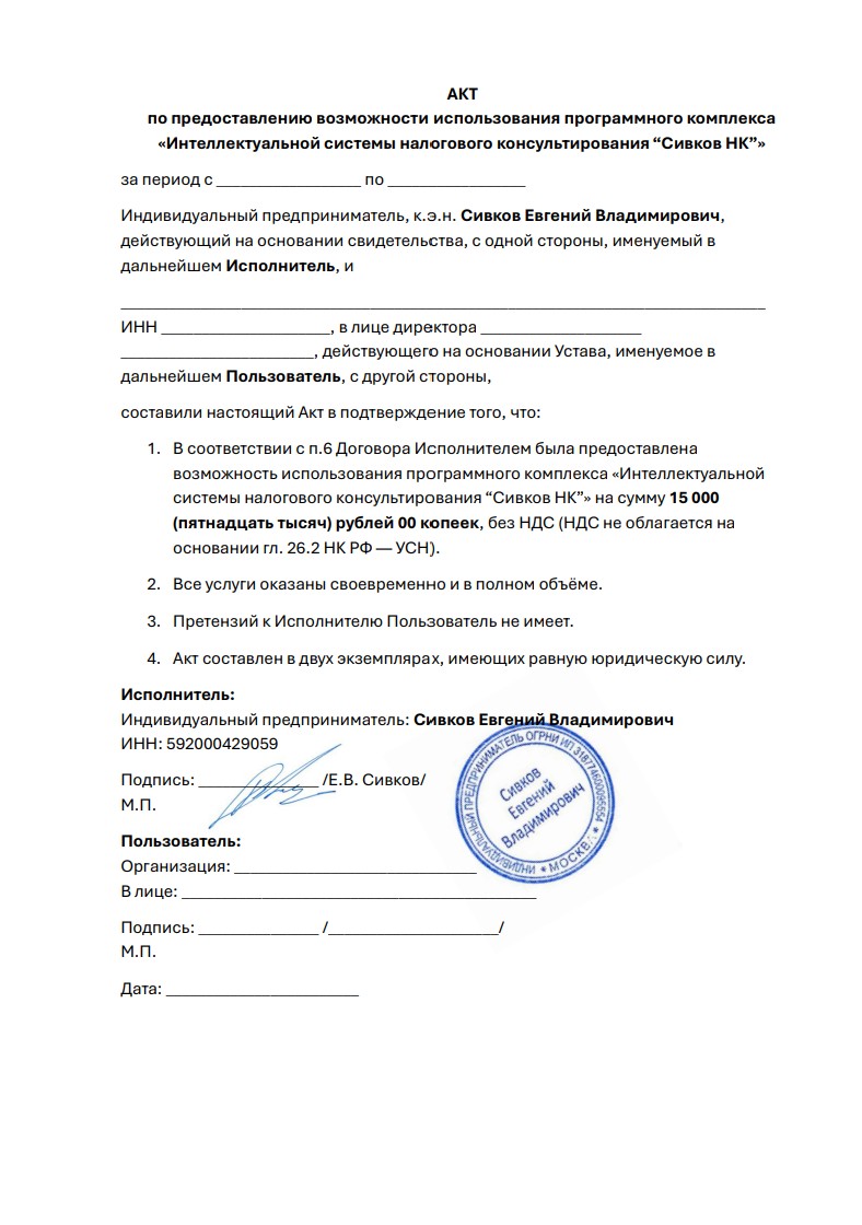 Первичные документы: 1. Договор оферты; 2. Платёжное поручение (любой документ подтверждающий оплату); 3. При желании можно распечатать Акт (указав период использовании программы)